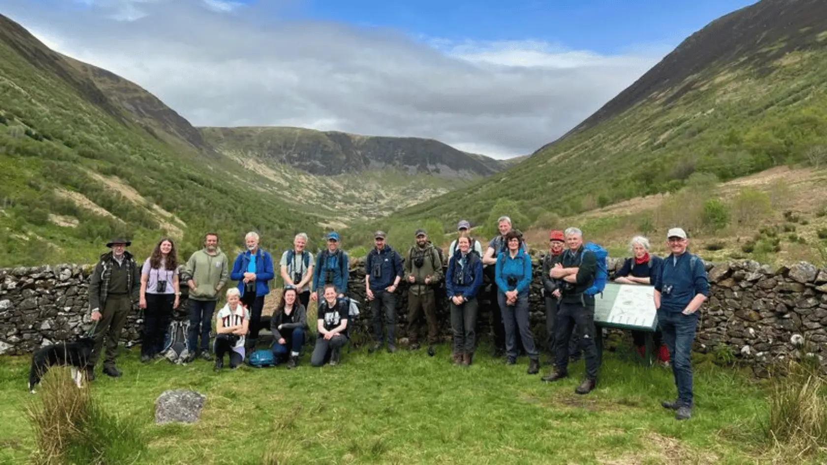 Two founders of the Borders Forest Trust (in red), a ranger, two sheepdogs, and a visiting group from Yorkshire Wildlife Trust stood for this picture at the head of the ...